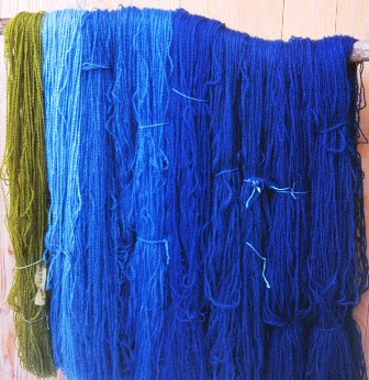 Denne omgangen med grønn farget garn ble ved en feil skylt i samme vann som det var litt blå i…. Garnet med de sterkeste farger er Drops Alpaca Silk, noe alpakka garn jeg hadde liggende og Gästrike tråds. Du får prøve farging på små garnhesper på kurset. OBS vi bruker flytende farge så her kan det bli søl!